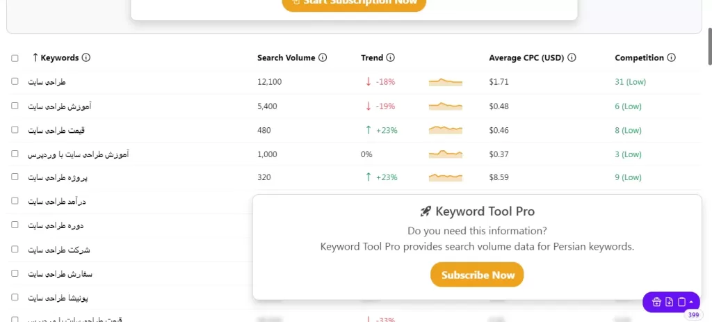 در تصویر زیر همان کلمه کلیدی را در keywordtool جستجو کرده ایم. می بینید که بسیاری از کلمات مرتبط با یک موضوع را به شما نشان داده است. در بین این کلمات می توانید از کلمات مناسب برای مطالب خود استفاده کنید.